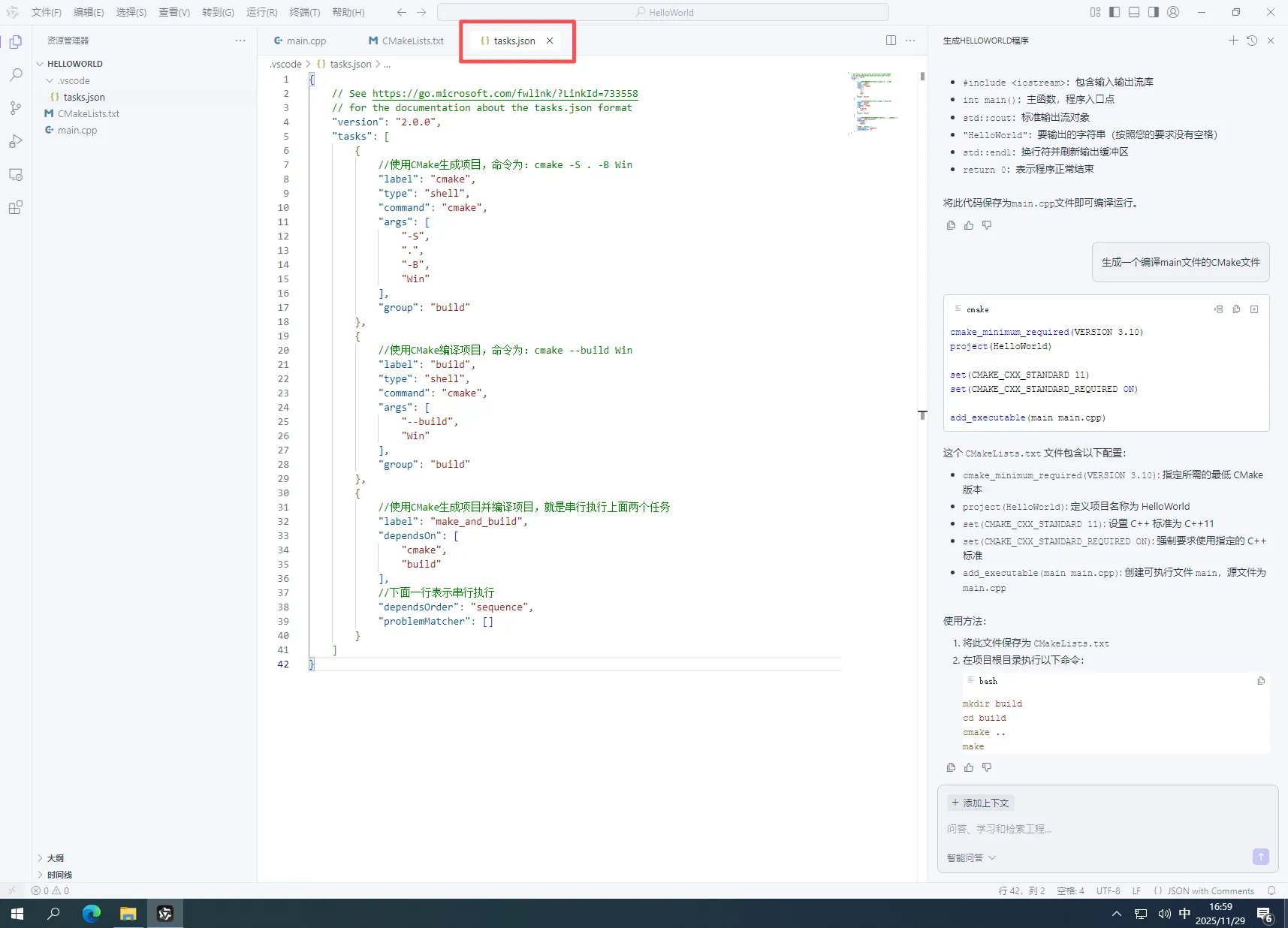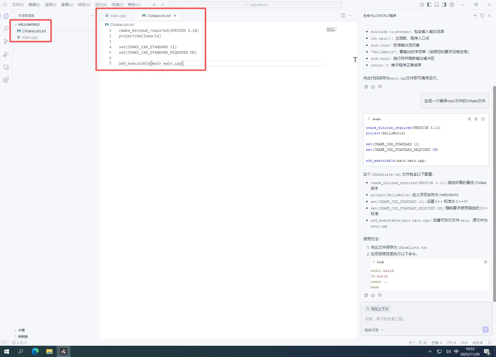 6.在AI对话框中,输入“生成一个编译main文件的CMake文件”然后回车,如下图所示: