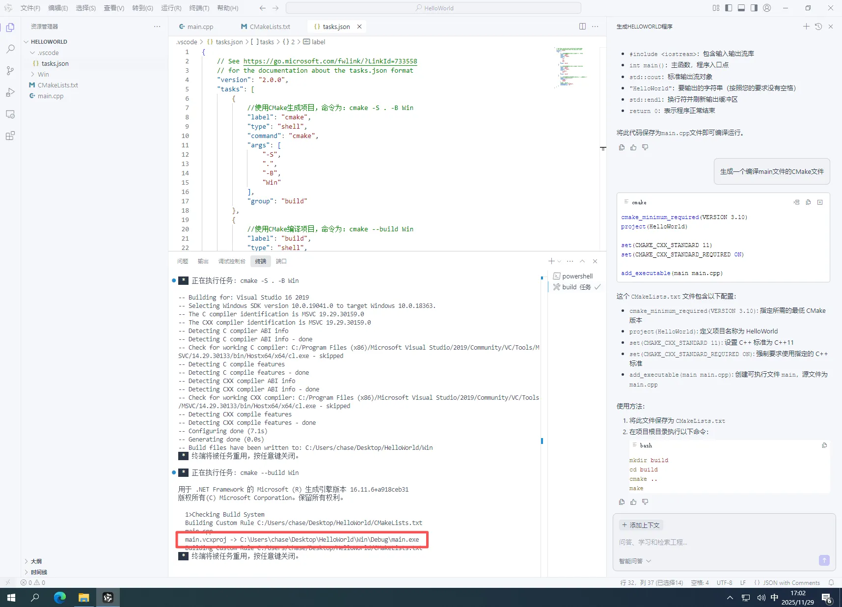//使用CMake编译项目,命令为:cmake --build Win