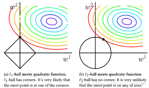 可以看到,L1-ball 与L2-ball 的不同就在于L1在和每个坐标轴相交的地方都有“角”出现,而目标函数的测地线除非位置摆得非常好,大部分时候都会在角的地方相交。注意到在角的位置就会产生稀疏性,例如图中的相交点就有w1=0,而更高维的时候(想象一下三维的L1-ball 是什么样的?)除了角点以外,还有很多边的轮廓也是既有很大的概率成为第一次相交的地方,又会产生稀疏性。
