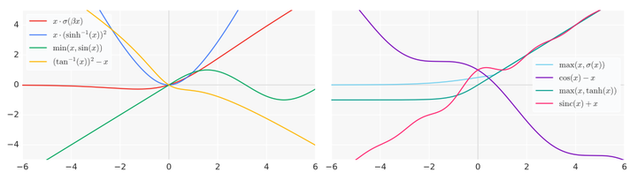 在搜索过程中,他们发现表现比较好的激活函数都比较简单(由两个以内的单元组成)且由原始输入x组合成(即b(x, g(x)))。同时,它们都是光滑的(与ReLU不同),而且有些并不是单调的(比如表现最好的Swish函数)。