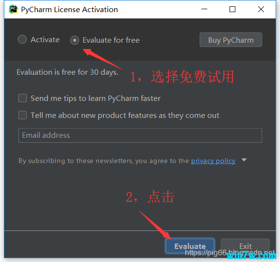 如果你是刚下载的pycharm,则需要点击激活窗口的“Evaluate for free”免费试用,然后再创建一个空项目,这样就可以进入到pycharm的工作页面.