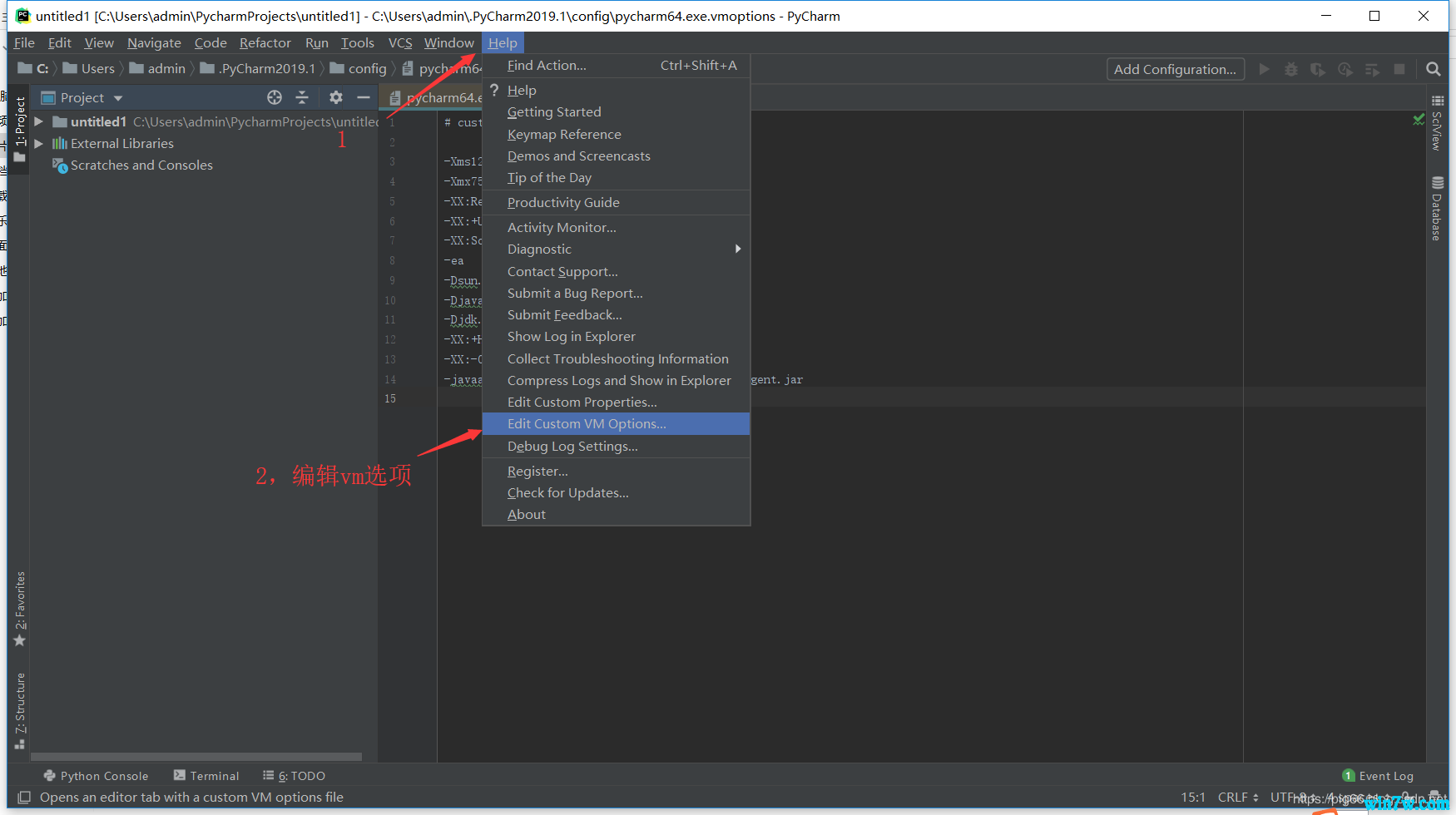 点击Pycharm最上面的菜单栏中的"Help" -> "Edit Custom VM Options ...",如果提示是否要创建文件,请点"Yes"。