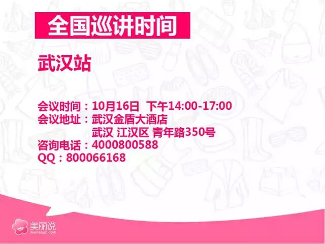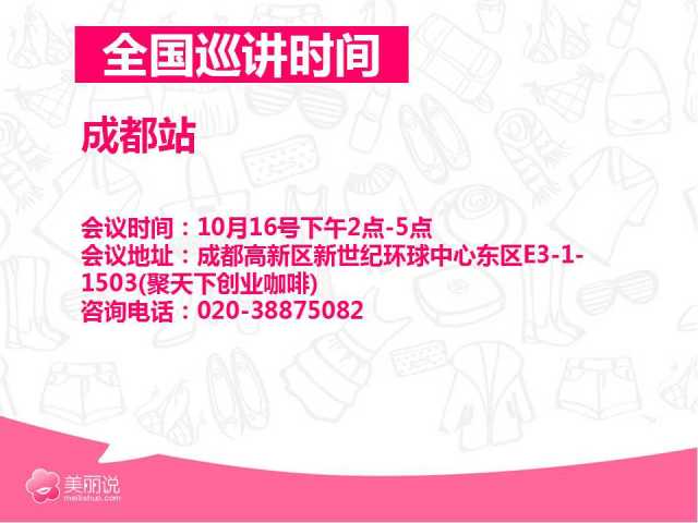 五、5大城市政策宣讲,北京、广州、杭州、武汉、成都五大城市线下宣讲,为地区商家全面解读美丽说双十一激励政策,力保商家出色应对。