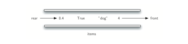 假定队尾在列表中的位置为 0,这允许我们使用列表的插入函数向队尾添加新元素。弹出操作可用于删除队首的元素(列表的最后一个元素)。这也意味着入队为 O(n),出队为 O(1)。