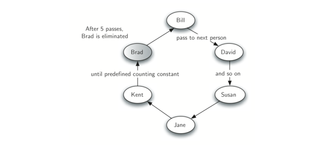首先,让我们看看孩子们的游戏烫手山芋,在这个游戏中(见下图),孩子们围成一个圈,并尽可能快的将一个山芋递给旁边的孩子。在某一个时间,动作结束,有山芋的孩子从圈中移除。游戏继续开始直到剩下最后一个孩子。这个游戏相当于著名的约瑟夫问题。