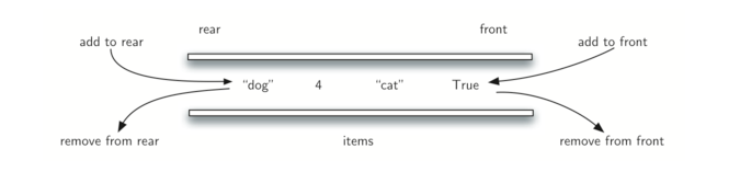 双端队不同的地方是添加和删除项是非限制性的。可以在前面或后面添加新项;同样,可以从任一端移除现有项。