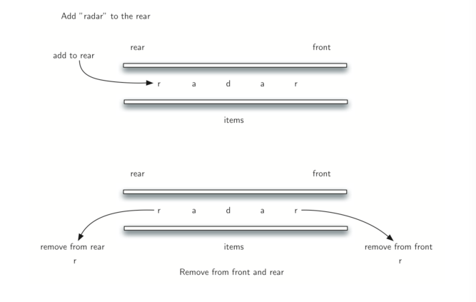 使用 deque 数据结构可以容易地解决经典回文问题。回文是一个字符串,读取首尾相同的字符,例如,radar toot madam。 我们想构造一个算法输入一个字符串,并检查它是否是一个回文。