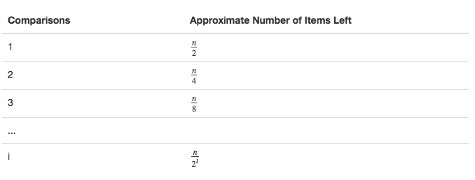求解 i 得出 i=logn 。 最大比较数相对于列表中的项是对数的。 因此,二分查找是 O(logn)。