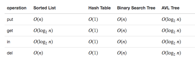通过保持树在所有时间的平衡,我们可以确保 get 方法将按 \(O(log2(n))\) 时间运行。但问题是我们的 put 方法有什么成本?让我们将它分解为 put 执行的操作。由于将新节点作为叶子插入,更新所有父节点的平衡因子将需要最多 \(log2^n\) 运算,树的每层一个运算。如果发现子树不平衡,则需要最多两次旋转才能使树重新平衡。但是,每个旋转在 \(O(1)\)时间中工作,因此我们的put操作仍然是 \(O(log2^n)\)。