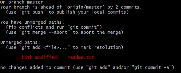 Auto-merging readme.txt CONFLICT (content): Merge conflict in readme.txt Automatic merge failed; fix conflicts and then commit the result.这意味着无法完成自动合并,此时使用