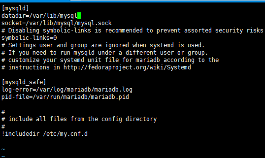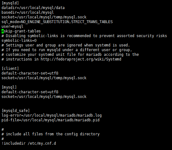 [mysqld] datadir=/usr/local/mysql/data basedir=/usr/local/mysql socket=/usr/local/mysql/temp/mysql.sock sql_mode=NO_ENGINE_SUBSTITUTION,STRICT_TRANS_TABLES user=mysql #skip-grant-tables # Disabling symbolic-links is recommended to prevent assorted security risks symbolic-links=0 # Settings user and group are ignored when systemd is used. # If you need to run mysqld under a different user or group, # customize your systemd unit file for mariadb according to the # instructions in http://fedoraproject.org/wiki/Systemd [client] default-character-set=utf8 socket=/usr/local/mysql/temp/mysql.sock [mysql] default-character-set=utf8 socket=/usr/local/mysql/temp/mysql.sock [mysqld_safe] log-error=/usr/local/mysql/mariadb/mariadb.log pid-file=/usr/local/mysql/mariadb/mariadb.pid # # include all files from the config directory # !includedir /etc/my.cnf.d