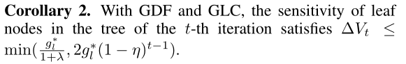 GDF为所有树设置相同敏感度,但随着迭代(收敛)进行,敏感度也会随之变化,精确推导太难了,而且阈值设置不适当会引起过大的精度损失,需要新方法控制不同树之间的衰减,在内部节点加噪声会影响当前分裂的gain,而在叶子节点加噪声会直接影响预测值,这里focus叶子结点的敏感度bounding