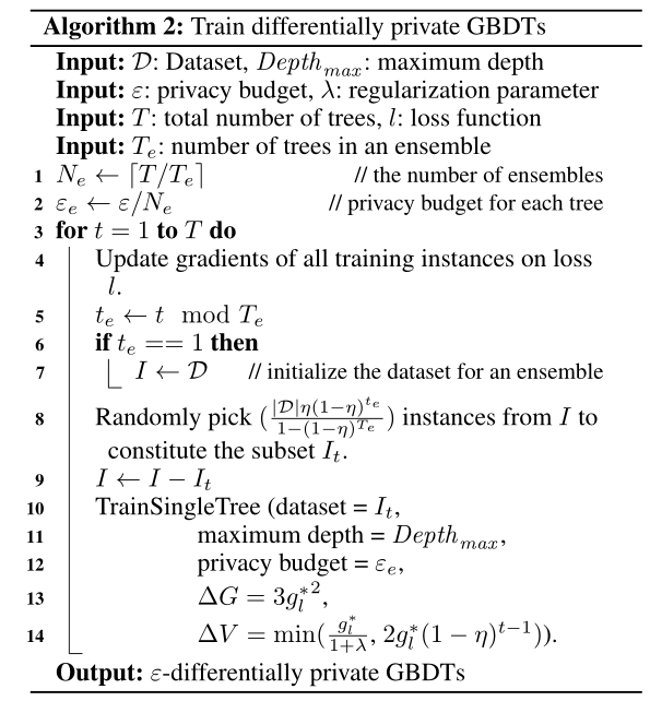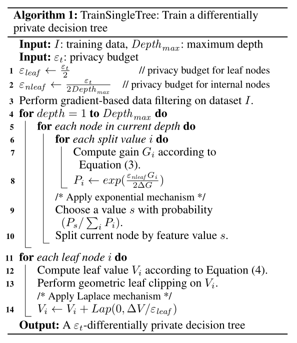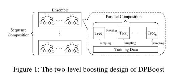 简单说,本文主要是在敏感度计算上得到了更精确的值,之后用的两次加噪,一次是指数机制,用在分裂时选取哪个作为分割点,score func是“the gain of the split”,一次是Laplace机制用在叶节点的取值上;用不相交数据子集训练不同树,是parallel composition,不同iteration是seq composition(figure 1)