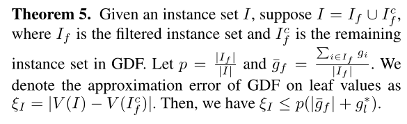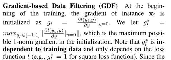 由于梯度是基于预测值和目标值之间的距离来计算的,所以裁剪梯度意味着间接改变目标值,这可能导致巨大的精度损失。因此提出了Gradient-based Data Filtering (GDF),想在每次迭代尽可能过滤掉少的数据来bound梯度,减少对acc的影响。