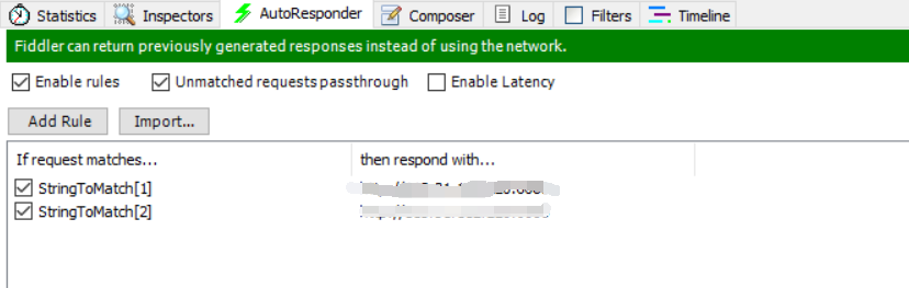 3.在autoresponder 中勾选“enable rules”和“unmatched requests passthrough” 后,添加上相应的域名。