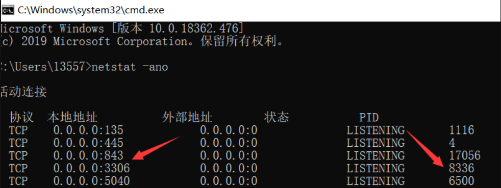 (1)打开cmd 输入netstat -ano 找到本地地址为0.0.0.0:3306的地址,记住其PID的值