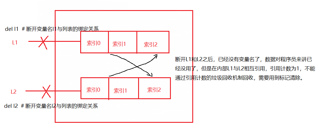del name1(del是解除变量名name1与变量值'Alex'之间的关系,变量值'Alex'的引用计数为0),变量值'Alex'的引用计数为0,其占用的内存空间就会被回收