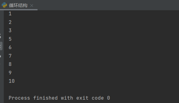 count = 1 while count < 11: if count == 4: count += 1 continue # 直接结束本次循环,回到条件判断处开始下一次循环 print(count) count +=1
