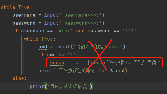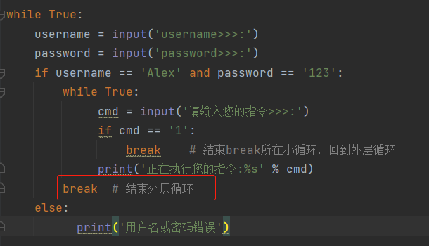 强调:有几个while的嵌套 想一次性结束 就应该写几个break。