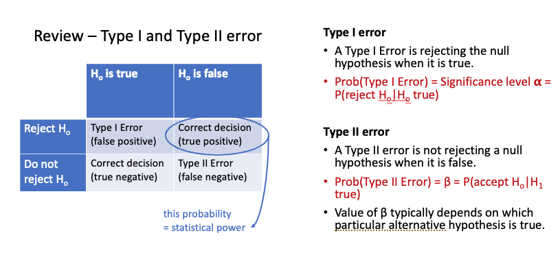 把没有拒绝错误的null hypothesis的错误称为type II error (\(\beta\))