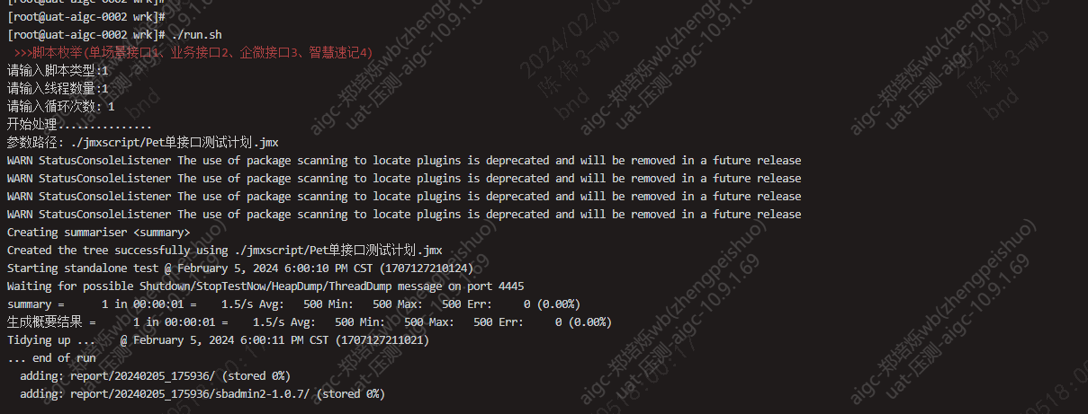#!/bin/bash TIMESTAMP=$(date +"%Y%m%d_%H%M%S") echo -e "\033[31m >>>脚本枚举(单场景接口1、业务接口2、企微接口3、智慧速记4) \033[0m" read -p "请输入脚本类型:" scripttype read -p "请输入线程数量:" threadsnum read -p "请输入循环次数: " cycles if [[ $threadsnum =~ ^[0-9]+$ ]] && [[ $cycles =~ ^(-1|[0-9]+)$ ]]; then if [ $scripttype == 1 ] ;then filepath="./jmxscript/Pet单接口测试计划.jmx" elif [ $scripttype == 2 ];then filepath="./jmxscript/Pet业务测试计划.jmx" elif [ $scripttype == 3 ];then filepath="./jmxscript/Pet企微测试计划.jmx" elif [ $scripttype == 4 ];then filepath="./jmxscript/Pet智慧速记测试计划.jmx" else echo "没有符合的条件" exit 1 fi echo "开始处理..............." python3 ./jmx_handle.py $filepath #执行生成报告 /usr/local/codes/apache-jmeter-5.6.2/bin/jmeter.sh -n -t $filepath -Jconcurrent_number=$threadsnum -Jcycles=$cycles -l /tmp/wrk/log/results_log${TIMESTAMP}.jtl -e -o "/tmp/wrk/report/${TIMESTAMP}" if [ -d "./report/${TIMESTAMP}" ] && [ -n "$(ls -A "./report/${TIMESTAMP}")" ]; then zip -r ./report/${TIMESTAMP}.zip ./report/${TIMESTAMP} else echo -e "\033[31m >>>>>>>目录不存在或目录为空,报告生成失败!>>>>>>\033[0m" fi else echo "输入的不是正整数,程序退出!" fi
