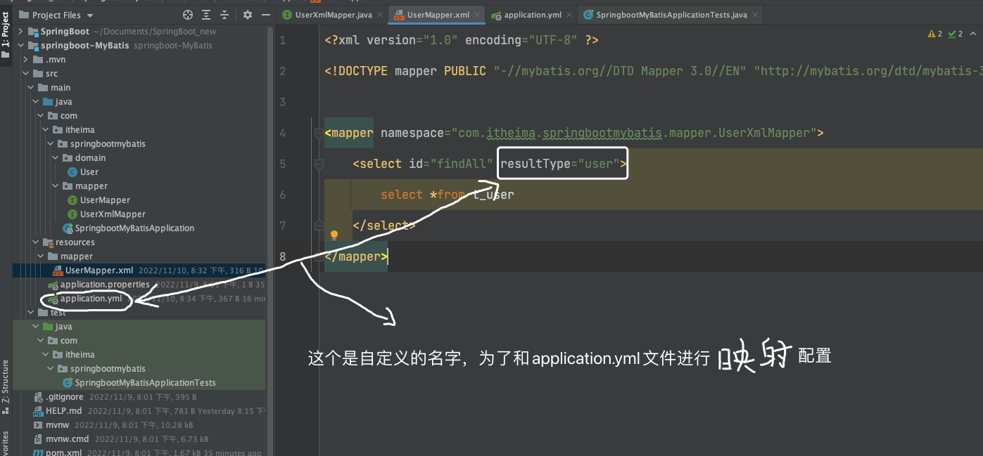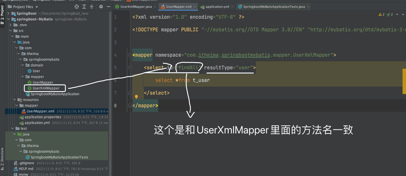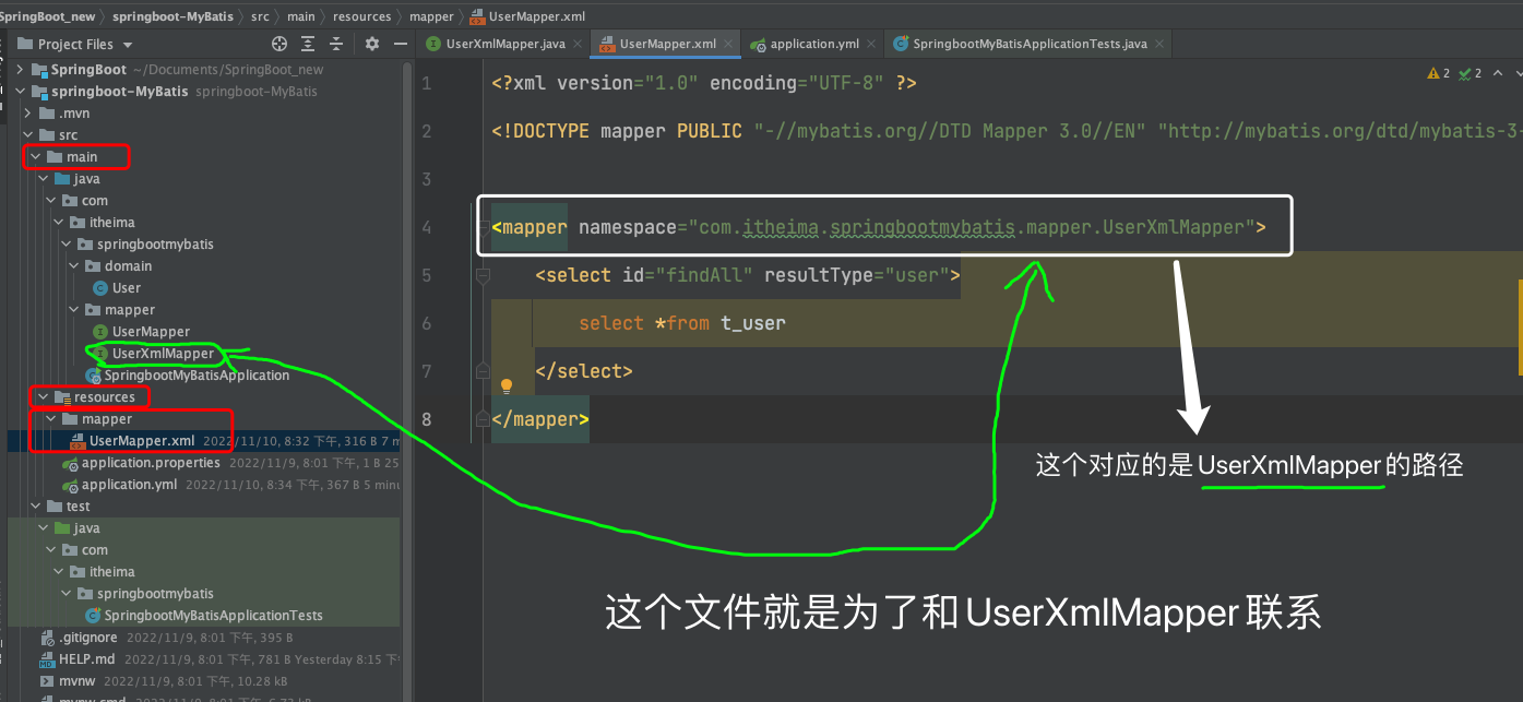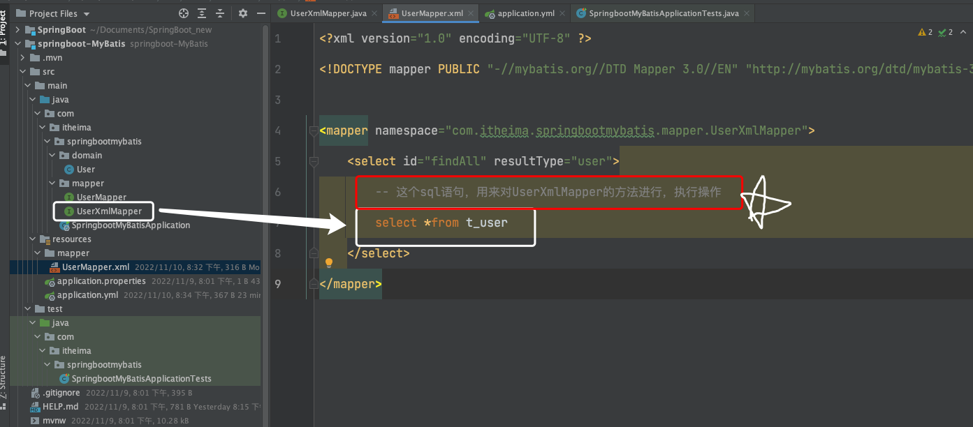 <mapper namespace="com.itheima.springbootmybatis.mapper.UserXmlMapper">