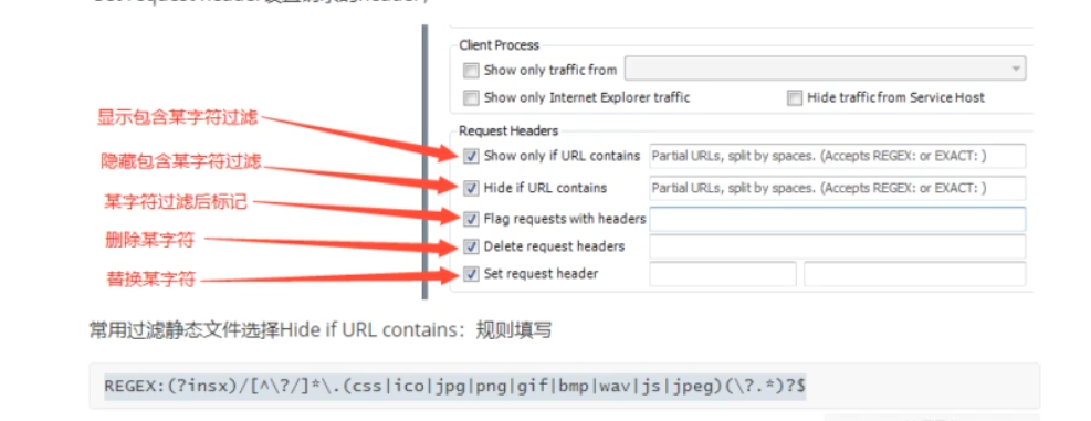 选中Filters ->Request Header模块->勾选 Hide if URL contains->输入正则表达式:REGEX:(?insx)/[^\?/]*.(css|ico|jpg|png|gif|bmp|wav|js|jpeg)(\?.*)?$