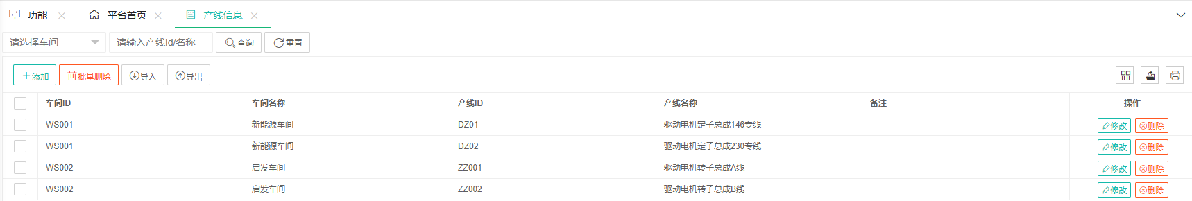 产线ID、产线名称、车间ID |
