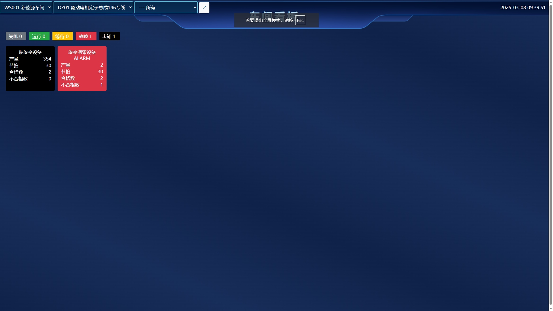 选择车间、产线、设备 统计当前设备状态数量(开机/关机/故障) 显示设备信息(状态、产量、节拍、合格数、不合数) |
