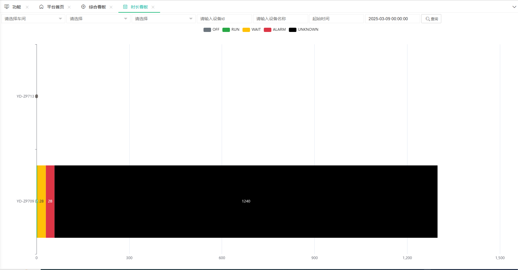 选择车间、产线、设备、时间段 显示统计设备时长(开机/关机/故障) |