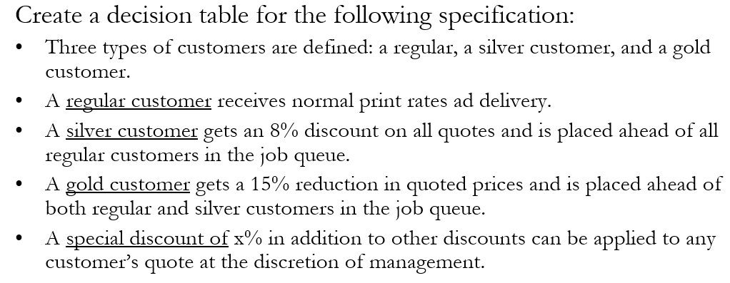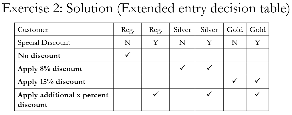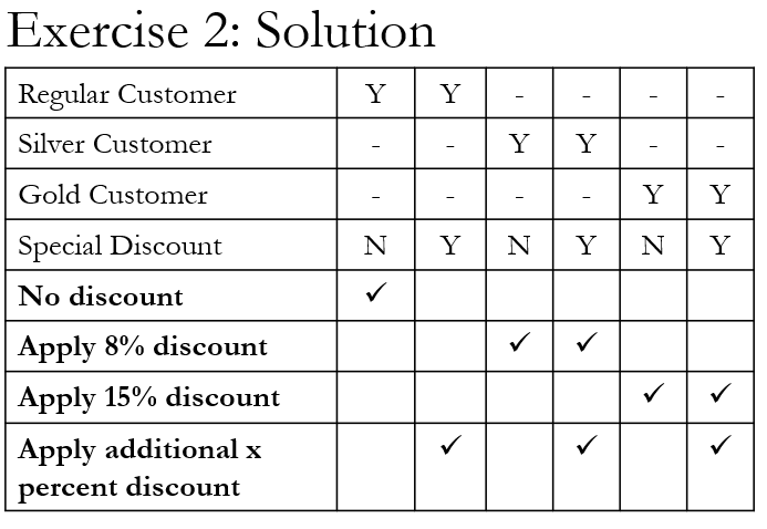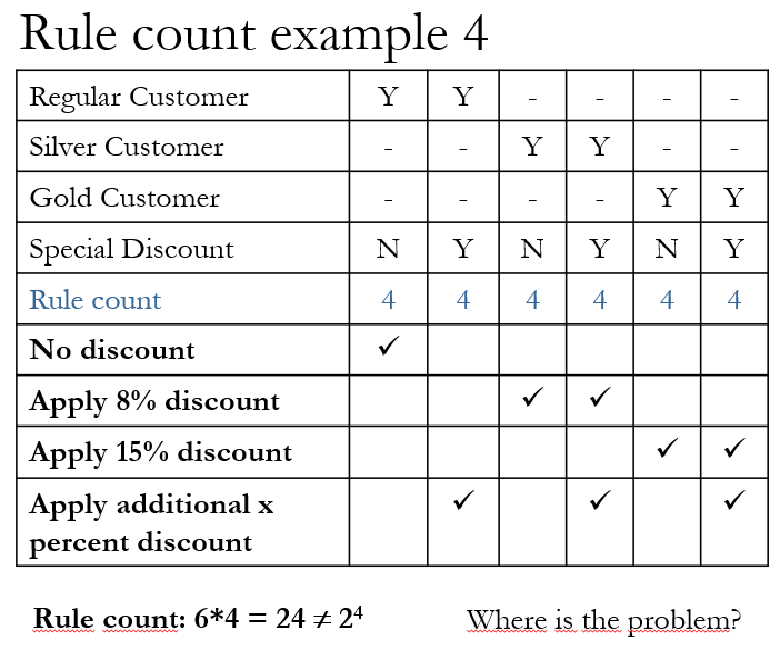 - Decision tables grow exponentially, if we add conditions. 如果我们增加条件,决策表会呈指数级增长。