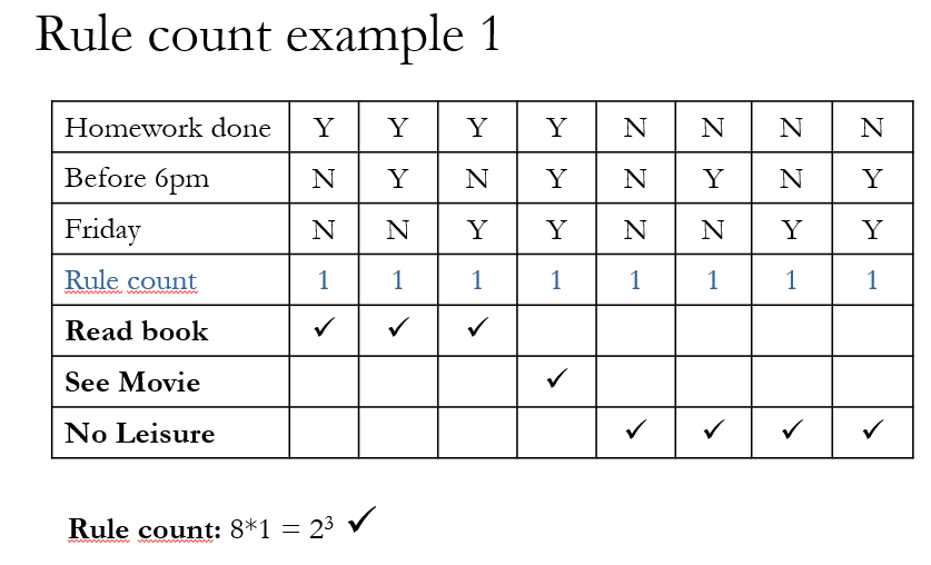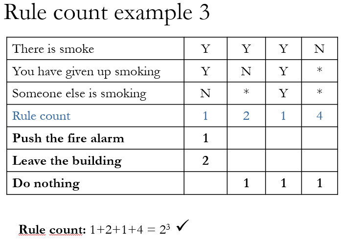 - Using “don’t care” values (*) May occur of a certain condition is irrelevant for an given action //使用 "不关心 "的值(*):某个条件可能发生,但与给定的行动无关