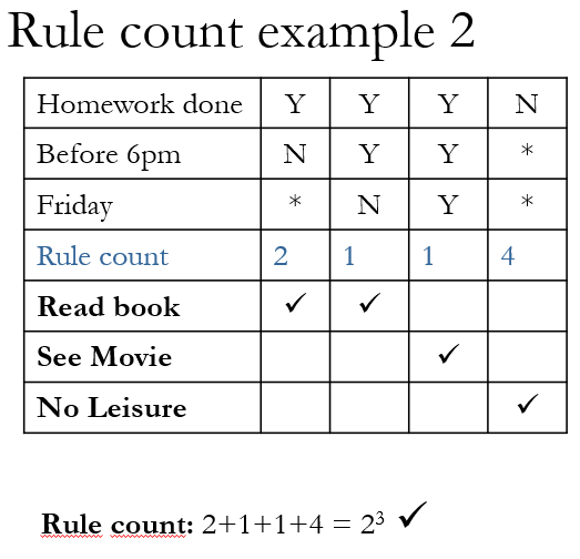 - Don't care entries (*) and impossible situations (-) reduce the number of explicit rules by implying the existence of non-explicitly stated rules.