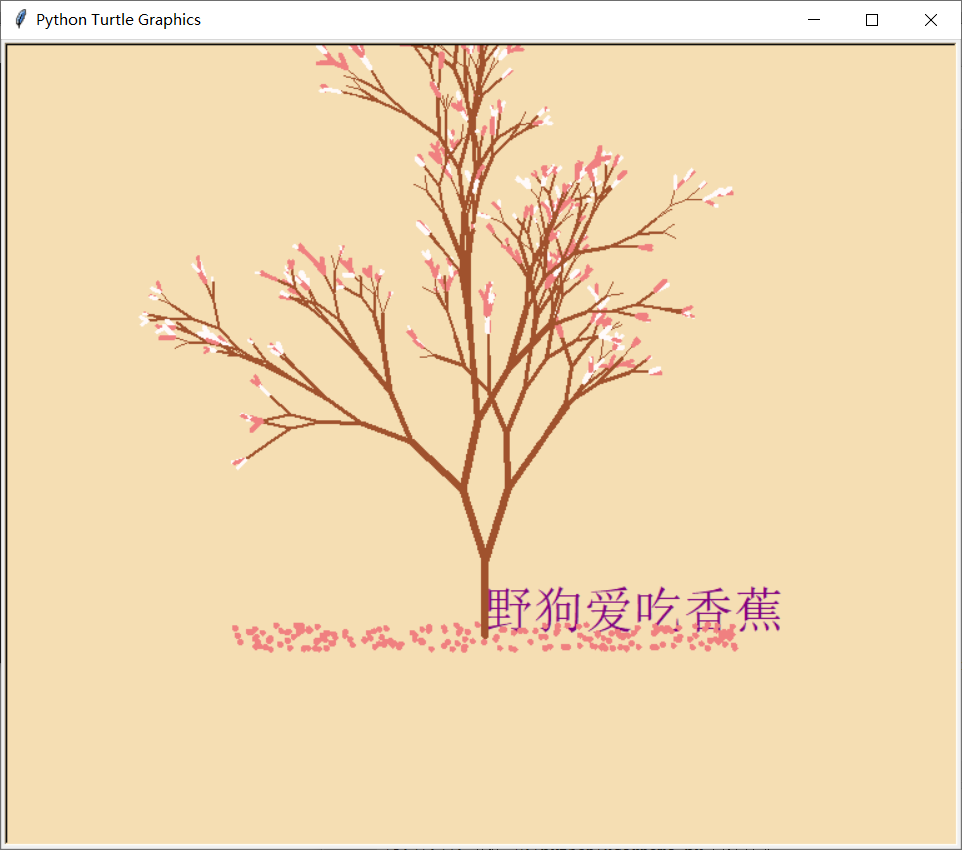 1 import turtle as T 2 import random 3 import time 4 5 # 画樱花的躯干(60,t) 6 def Tree(branch, t): 7 time.sleep(0.0005) 8 if branch > 3: 9 if 8 <= branch <= 12: 10 if random.randint(0, 2) == 0: 11 t.color('snow') # 白 12 else: 13 t.color('lightcoral') # 淡珊瑚色 14 t.pensize(branch / 3) 15 elif branch < 8: 16 if random.randint(0, 1) == 0: 17 t.color('snow') 18 else: 19 t.color('lightcoral') # 淡珊瑚色 20 t.pensize(branch / 2) 21 else: 22 t.color('sienna') # 赭色 23 t.pensize(branch / 10) # 6 24 t.forward(branch) 25 a = 1.5 * random.random() 26 t.right(20 * a) 27 b = 1.5 * random.random() 28 Tree(branch - 10 * b, t) 29 t.left(40 * a) 30 Tree(branch - 10 * b, t) 31 t.right(20 * a) 32 t.up() 33 t.backward(branch) 34 t.down() 35 36 # 掉落的花瓣 37 def Petal(m, t): 38 for i in range(m): 39 a = 200 - 400 * random.random() 40 b = 10 - 20 * random.random() 41 t.up() 42 t.forward(b) 43 t.left(90) 44 t.forward(a) 45 t.down() 46 t.color('lightcoral') # 淡珊瑚色 47 t.circle(1) 48 t.up() 49 t.backward(a) 50 t.right(90) 51 t.backward(b) 52 53 # 绘图区域 54 t = T.Turtle() 55 # 画布大小 56 w = T.Screen() 57 t.hideturtle() # 隐藏画笔 58 t.getscreen().tracer(5, 0) 59 w.screensize(bg='wheat') # wheat小麦 60 t.left(90) 61 t.up() 62 t.backward(150) 63 t.down() 64 t.color('sienna') 65 66 # 写字 67 t.color('purple') # 紫色 68 t.write('野狗爱吃香蕉',font=("name",30,"normal")) 69 70 # 画樱花的躯干 71 Tree(60, t) 72 # 掉落的花瓣 73 Petal(200, t) 74 w.exitonclick()