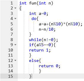 编写函数fun,其功能是:判断一个整数的各位数字平方之和能否被5整除,可以被5整除则返回1,否则返回0。
