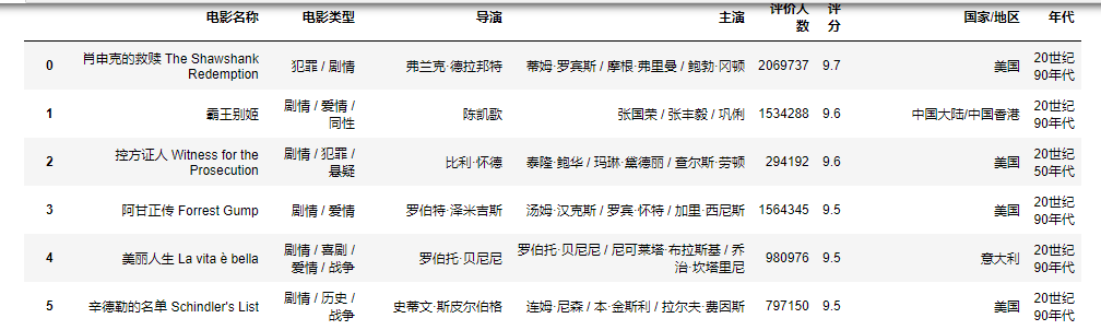 1 movies=get_movies("https://www.douban.com/doulist/240962/") 2 movies_1=pd.DataFrame({'电影名称':movies[0],'电影类型':movies[1],'导演':movies[6],'主演':movies[5],'评价人数':movies[2],'评分':movies[3],'国家/地区':movies[4],'年代':movies[7]}) 3 for i in range(1,18): 4 #总共18页,一页25个 5 link="https://www.douban.com/doulist/240962/?start="+str(i*25) 6 movies=get_movies(link) 7 movies_1=movies_1.append(pd.DataFrame({'电影名称':movies[0],'电影类型':movies[1],'导演':movies[6],'主演':movies[5],'评价人数':movies[2],'评分':movies[3],'国家/地区':movies[4],'年代':movies[7]}),ignore_index=True) 8 all_movies=movies_1