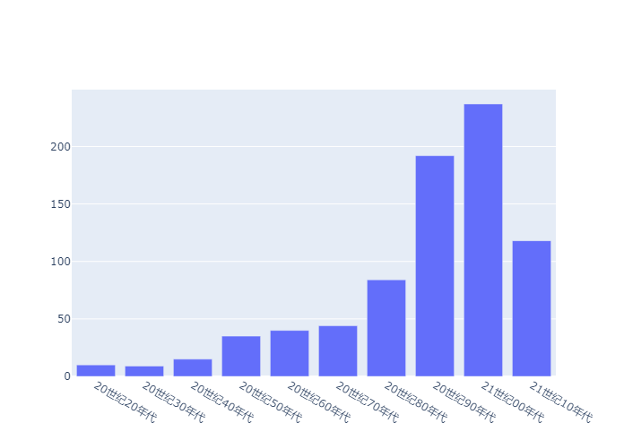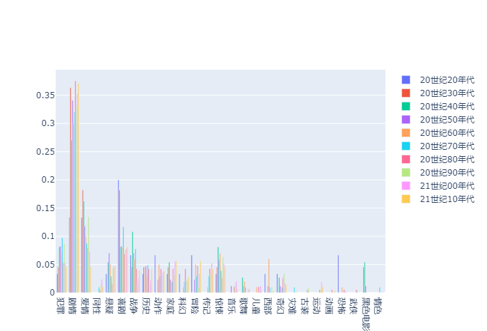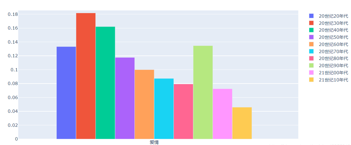 1 import plotly.graph_objects as go 2 3 fig = go.Figure() 4 fig.add_trace(go.Bar( 5 x=k, 6 y=get_ep(l20_20,k), 7 name='20世纪20年代', 8 )) 9 fig.add_trace(go.Bar( 10 x=k, 11 y=get_ep(l20_30,k), 12 name='20世纪30年代', 13 )) 14 fig.add_trace(go.Bar( 15 x=k, 16 y=get_ep(l20_40,k), 17 name='20世纪40年代', 18 )) 19 fig.add_trace(go.Bar( 20 x=k, 21 y=get_ep(l20_50,k), 22 name='20世纪50年代', 23 )) 24 fig.add_trace(go.Bar( 25 x=k, 26 y=get_ep(l20_60,k), 27 name='20世纪60年代', 28 )) 29 fig.add_trace(go.Bar( 30 x=k, 31 y=get_ep(l20_70,k), 32 name='20世纪70年代', 33 )) 34 fig.add_trace(go.Bar( 35 x=k, 36 y=get_ep(l20_80,k), 37 name='20世纪80年代', 38 )) 39 fig.add_trace(go.Bar( 40 x=k, 41 y=get_ep(l20_90,k), 42 name='20世纪90年代', 43 )) 44 fig.add_trace(go.Bar( 45 x=k, 46 y=get_ep(l21_00,k), 47 name='21世纪00年代', 48 )) 49 fig.add_trace(go.Bar( 50 x=k, 51 y=get_ep(l21_10,k), 52 name='21世纪10年代', 53 )) 54 fig.show()