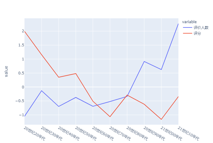 1 x=data.groupby('year')['评价人数','评分'].mean() 2 s=(x-x.mean())/x.std() 3 fig = px.line(s) 4 fig.show()