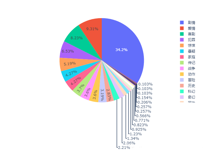 1 from collections import Counter 2 types=data['电影类型'].str.split('/') 3 l=[] 4 tl=[] 5 for i in range(783): 6 l.extend(types[i]) 7 for i in l: 8 tl.append(i.strip()) 9 c = Counter(tl) 10 k=list(c.keys()) 11 v=list(c.values()) 12 count=pd.DataFrame({'type':k,'c':v}) 13 count.sort_values(by='c') 14 total=count