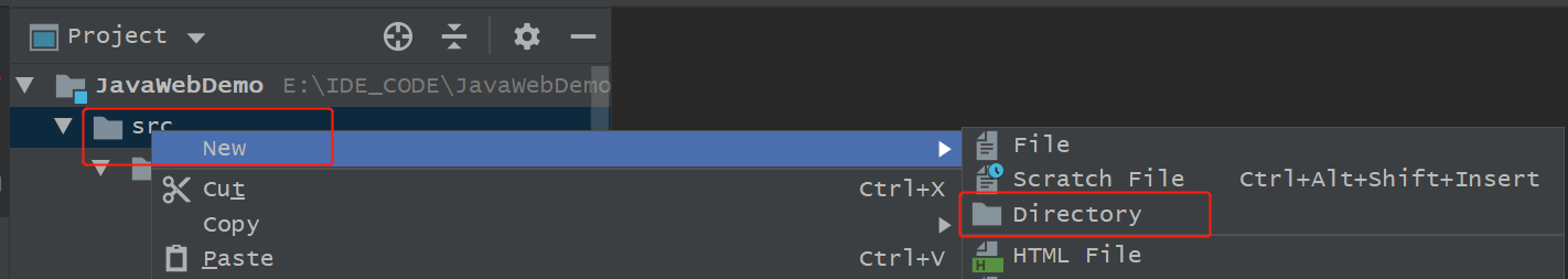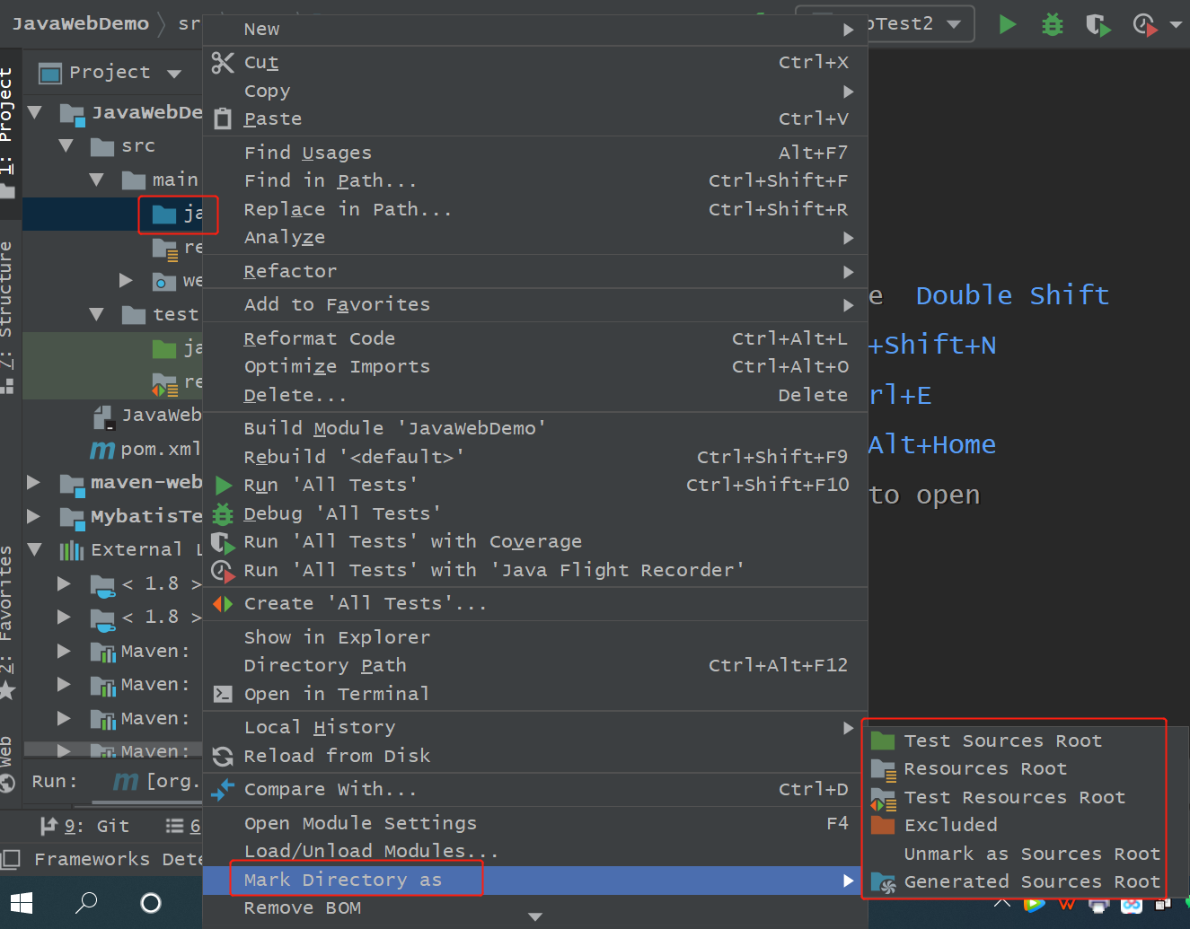 在新建的文件夹上右击--选择Mark Directory as--可以指定文件夹性质,以上main下的java、resources和test下的java、resources分别为: