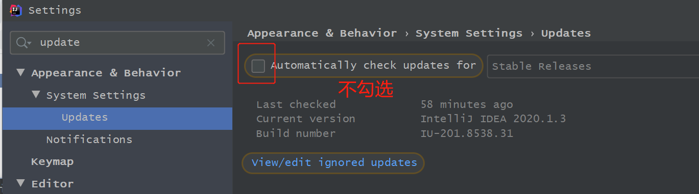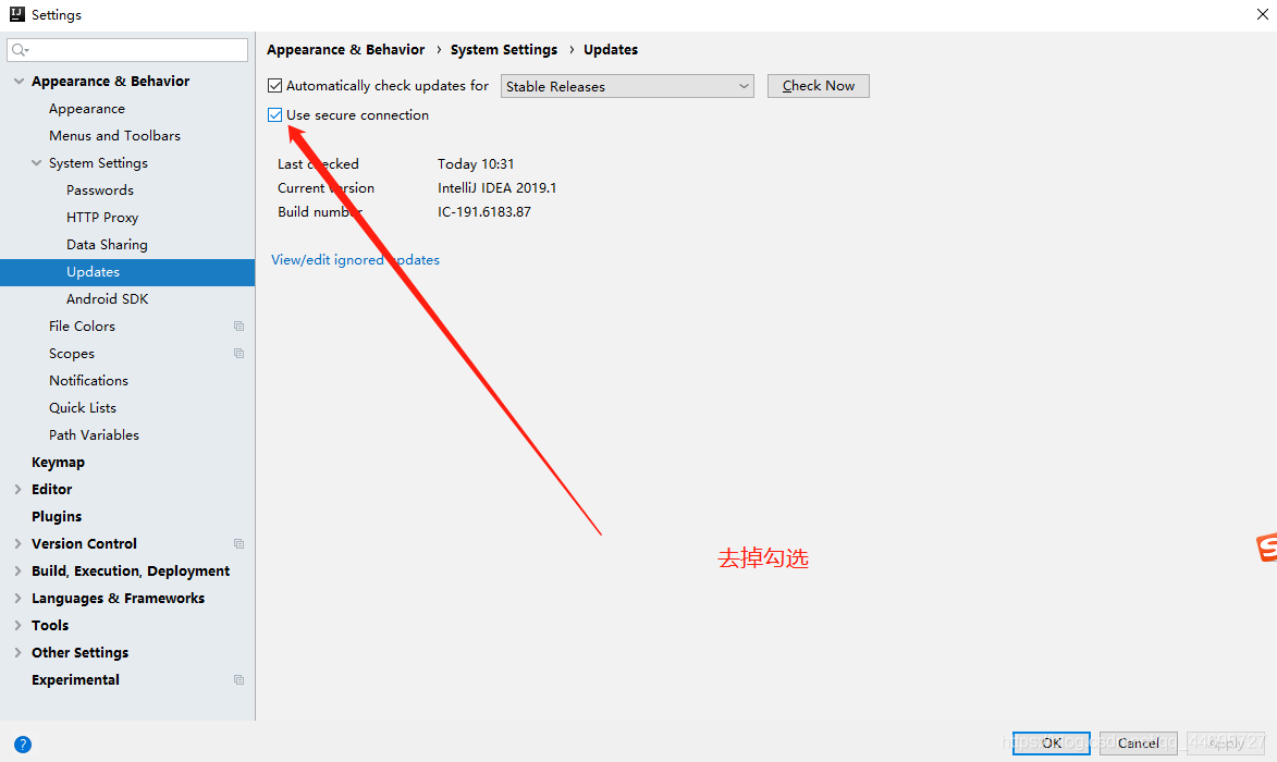方法1(老版本的)、File -> setting界面 -> Updates -> 去掉Use secure connection的勾