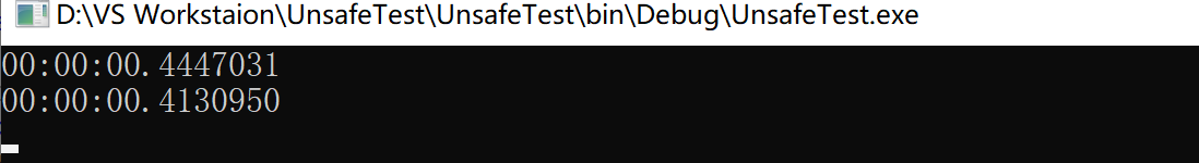 static void Main(string[] args) { NormalMethod(); UnsafeMethod(); Console.ReadLine(); } public static void NormalMethod() { byte[] bytes = new byte[10000 * 10000]; var t1 = DateTime.Now; for (int i = 0; i < bytes.Length; i++) { bytes[i] = 9; } var t2 = DateTime.Now; Console.WriteLine((t2 - t1).ToString()) ; } public static unsafe void UnsafeMethod() { var bytes = new byte[10000 * 10000]; var t1 = DateTime.Now; fixed (byte* p = bytes) { for (int i = 0; i < bytes.Length; i++) { p[i] = 9; } }; var t2 = DateTime.Now; Console.WriteLine((t2 - t1).ToString()); }