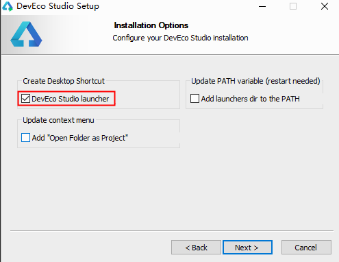 2.3. 双击下载的“deveco-studio-xxxx.exe”,进入DevEco Studio安装向导,在如下安装选项界面勾选DevEco Studio launcher后,点击Next,直至安装完成。