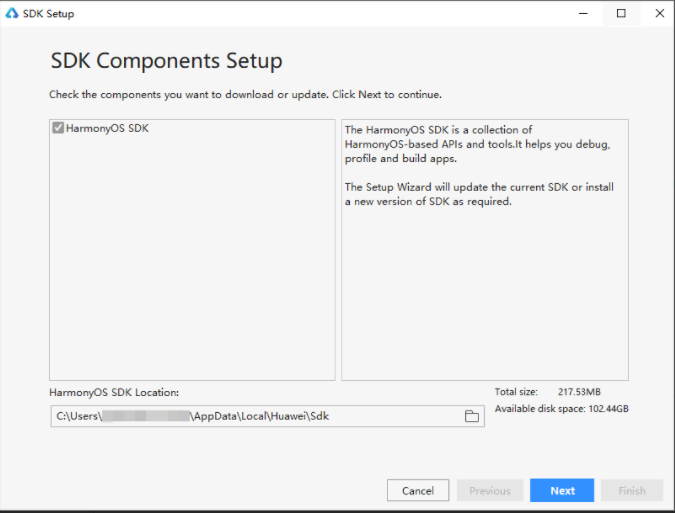2.5. 启动DevEco Studio,工具会自动检查本地路径下是否存在HarmonyOS SDK,如果不存在,会弹出如下向导,提示下载HarmonyOS SDK。