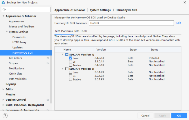 2.9. SDK默认会下载Java SDK和Toolchains,点击上图欢迎页中的Configure > Settings,进入HarmonyOS SDK页面。