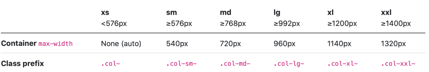 - Bootstrap(5.0)有六种默认响应尺寸:xs、sm、md、lg、xl、xxl,对应关系如下