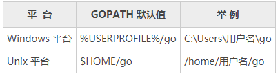 在 Go 1.8 版本之前,GOPATH 环境变量默认是空的。从 Go 1.8 版本开始,Go 开发包在安装完成后,将 GOPATH 赋予了一个默认的目录,参见下表。
