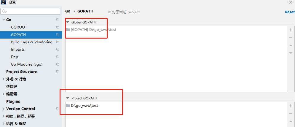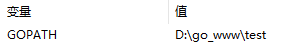 如我的项目名叫test,在D:\go_www\test下,则GOPATH的全局环境变量设置为D:\go_www\test