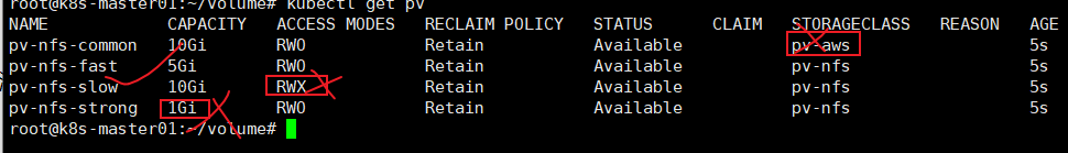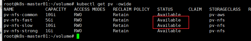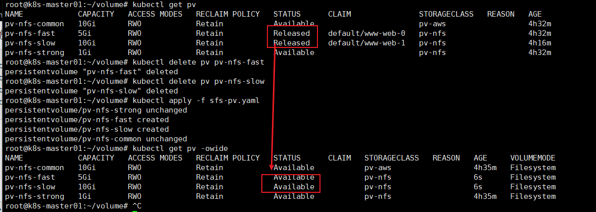 # kubectl delete pv pv-nfs-fast # kubectl delete pv pv-nfs-slow # kubectl apply -f sfs-pv.yaml # kubectl get pv -owide