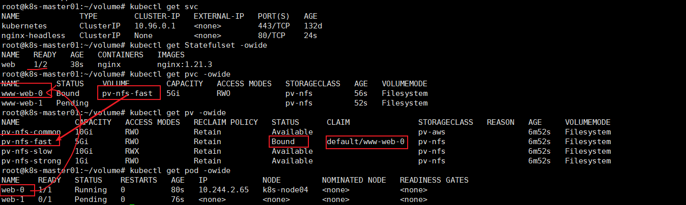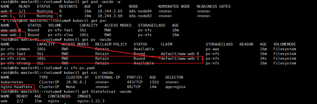 # kubectl apply -f sfs.yaml # kubectl get svc # kubectl get Statefulset -owide # kubectl get pvc -owide # kubectl get pv -owide # kubectl get pod -owide